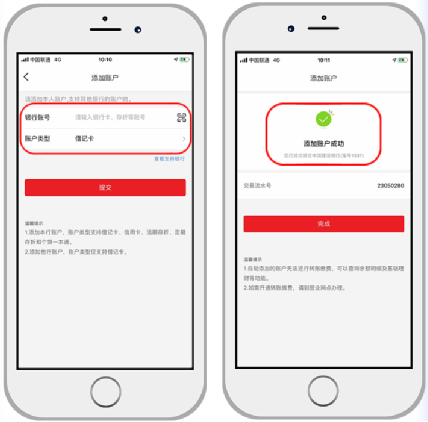 第三步:點擊添加賬戶—輸入本人名下他行銀行卡信息—進行人臉識別通過后綁定成功。