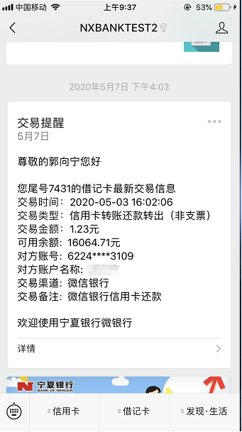 寧夏銀行微信借記卡動賬通知便捷上線!