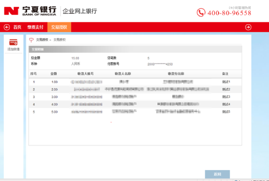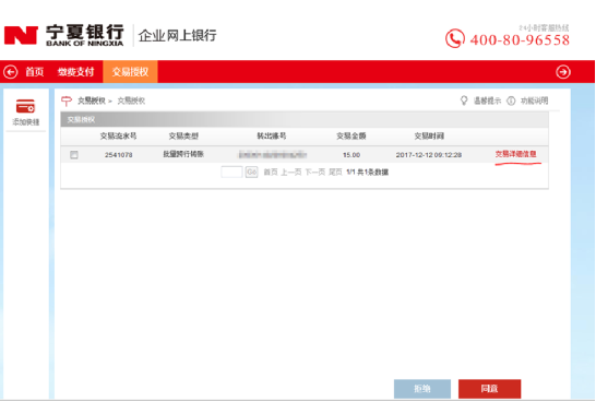 6、用企業(yè)審核員用戶登錄網(wǎng)銀系統(tǒng),進(jìn)入菜單“交易授權(quán)->交易授權(quán)”,點(diǎn)擊交易類型為“批量轉(zhuǎn)賬”記錄的最后列“交易詳細(xì)信息”,查看交易詳細(xì)信息,然后點(diǎn)擊“返回”;