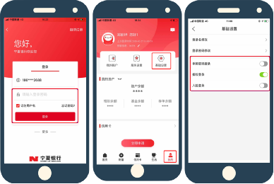 第三步使用您剛才設(shè)置的用戶名及登錄密碼登錄手機銀行(也支持銀行賬戶或手機號碼與登錄密碼組合進行登錄);登錄成功后可進入“我的”,點擊“基礎(chǔ)設(shè)置”;設(shè)置自己喜歡的手勢/指紋/人臉等登陸方式。